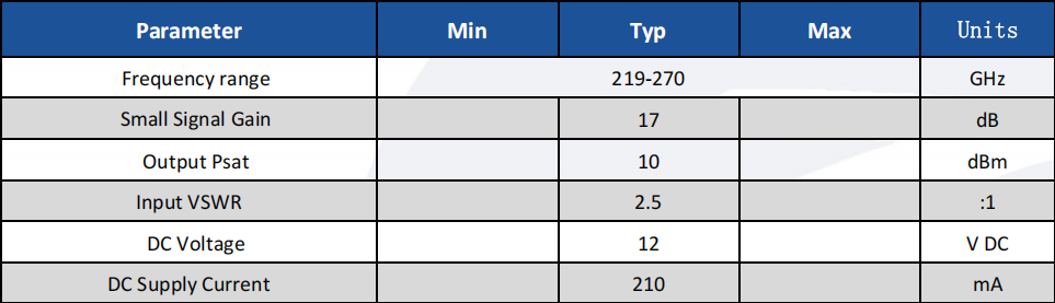 The 219–270?GHz power amplifier is characterized by its high operating frequency and broad bandwidth, making it a capable solution for advanced terahertz applications.