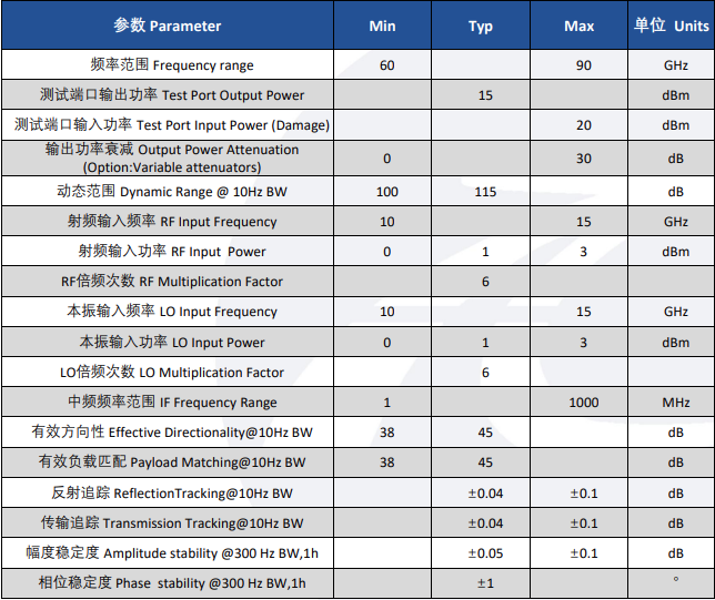 輸出功率高,頻率范圍可擴展至55-95GHz,程控調節范圍大;
